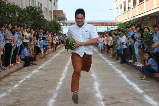 第一場接力賽;接力賽4人一組舉行(2男2女),共16組,每組參賽人員站在各自跑道,每個跑道存放一個西瓜(大小均勻西瓜),聽到裁判員發出“各就各位”口令后,參賽人員蹲下身抱起西瓜,當裁判員鳴哨后,參賽人員即可起動,抱起西瓜,沿著跑道向前方傳遞西瓜,這樣依此前進來回,直至最后一位參賽選手越過終點線為勝組。