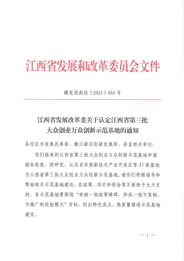 近日,省發(fā)改委印發(fā)《江西省發(fā)展改革委關(guān)于認(rèn)定江西省第三批大眾創(chuàng)業(yè)萬眾創(chuàng)新示范基地的通知》(贛發(fā)改高技〔2021〕665號),我公司認(rèn)定為江西省第三批大眾創(chuàng)業(yè)萬眾創(chuàng)新示范基地。